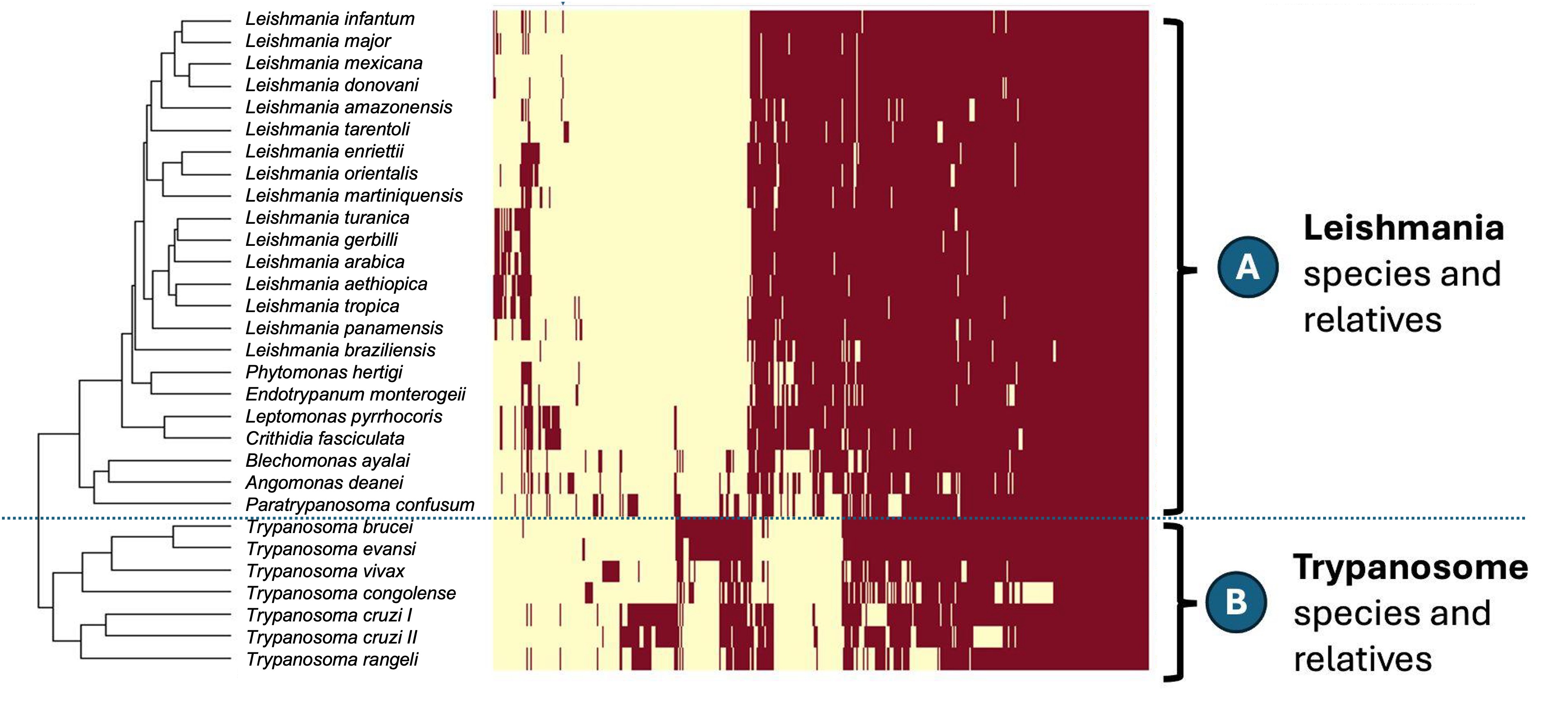 This is comparative genomics data. We download the sequences of all the protein-coding genes of each of these species, from the databse TriTrypDB. We then found clusters of orthologous groups (ie: groups of orthologs), using the OrthoFinder software. OrthoFinder identifies the clusters of orthologous groups. The plot above does not show when a species has multiple copies of a gene in an orthologous group (paralogs).