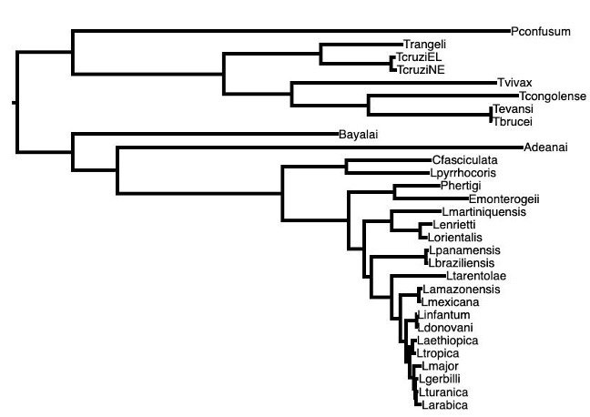 We can compare the cladogram of the Trypanosomatid species to Figure 2 (below), which is a phylogenetic tree drawn using the single nucleotide differences in ~1000 single copy genes (genes that every species has exactly one of). This phylogenetic tree will be very reliable, as it is created from tens of thousands of single nucleotide differences.