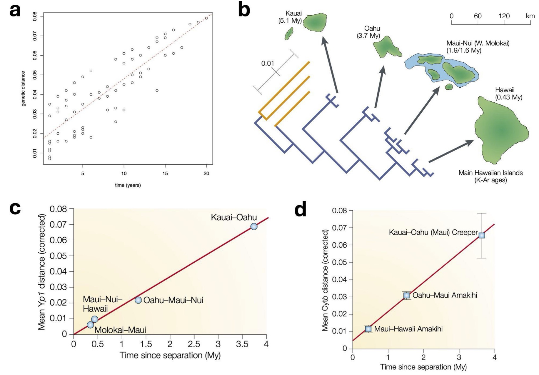 Figure 1. Evidence that molecular clock causes divergence between species over both short and long periods of time. Panel a: We saw from the influenza virus workshop that mutations occurred within influenza viruses at a regular rate with time over merely a few decades. Panel b: This also occurs over long periods of time. For example, geologists know that the Pacific islands of Hawaii have been formed over millions of years, emerging one after the other over the last 5 million years. Evolutionary biologists know that both honeycreeper birds and Drosophila fruit flies have populated these islands during this time, and from the geological data, we know how long ago they diverged. If we look at genetic data from the Yp1 gene in honeycreepers (Panel c) and the Cytb gene from fruit flies (Panel d), we observe a very consistent correlation between genetic distance (vertical axis) and time between island formation (horizontal axis). Just like the data you saw from the influenza virus, it looks very much like there is a constant rate of genetic divergence with time, this time over millions of years. Plots b-d are from Bromham and Penny, 2003.