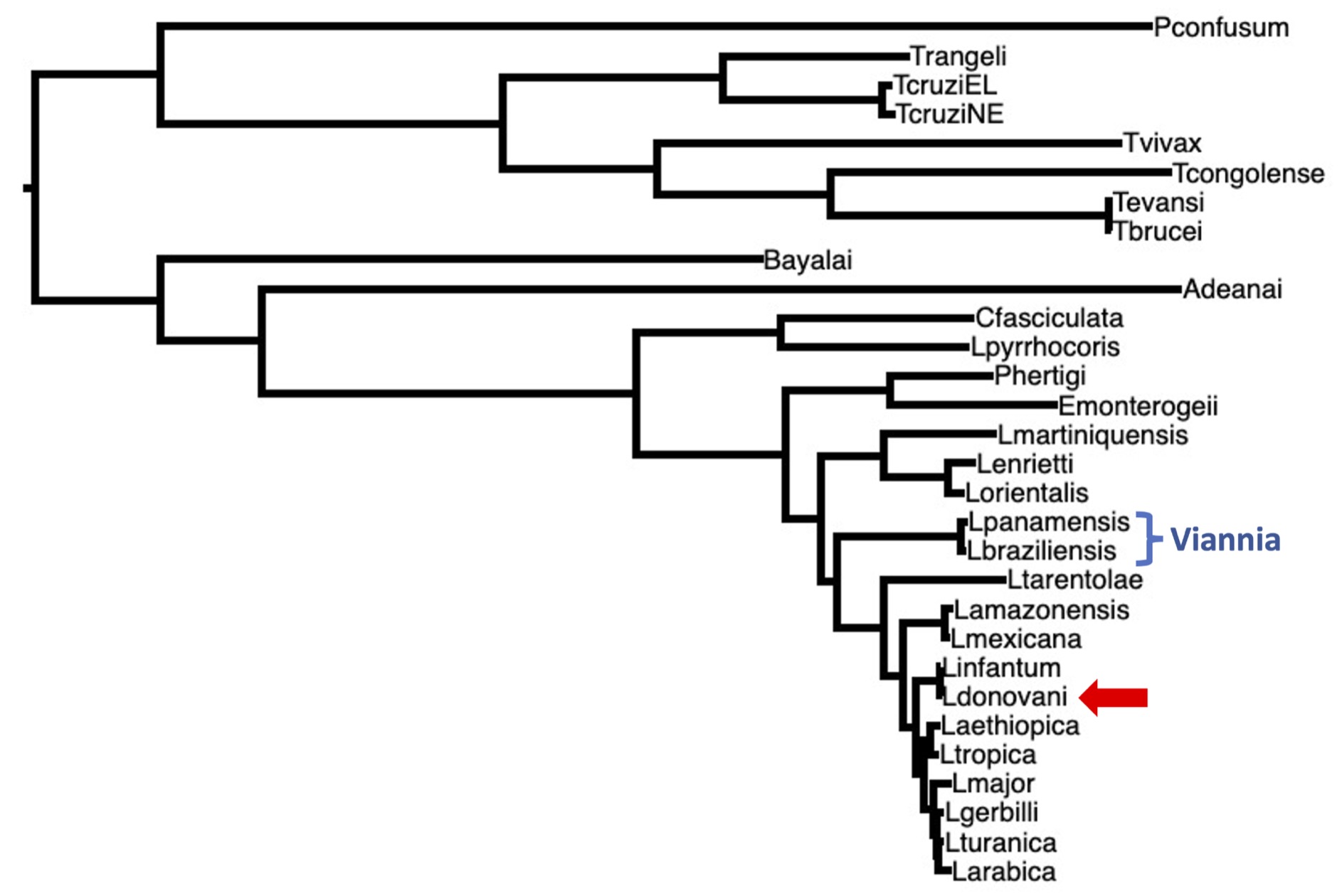 Figure 2. A phylogenetic tree of Leishmania and related species. Two of species that we looked at last time in the Viannia clade are included (blue brackets). Today, we will study genetic differences within the L. donovani species (red arrow). We will also look at genetic differences between species, by comparing L. braziliensis to L. donovani. We will also compare L. donovani proteins to a yeast species that diverged from Leishmania over a billion years ago (but yeast is not shown on this tree).