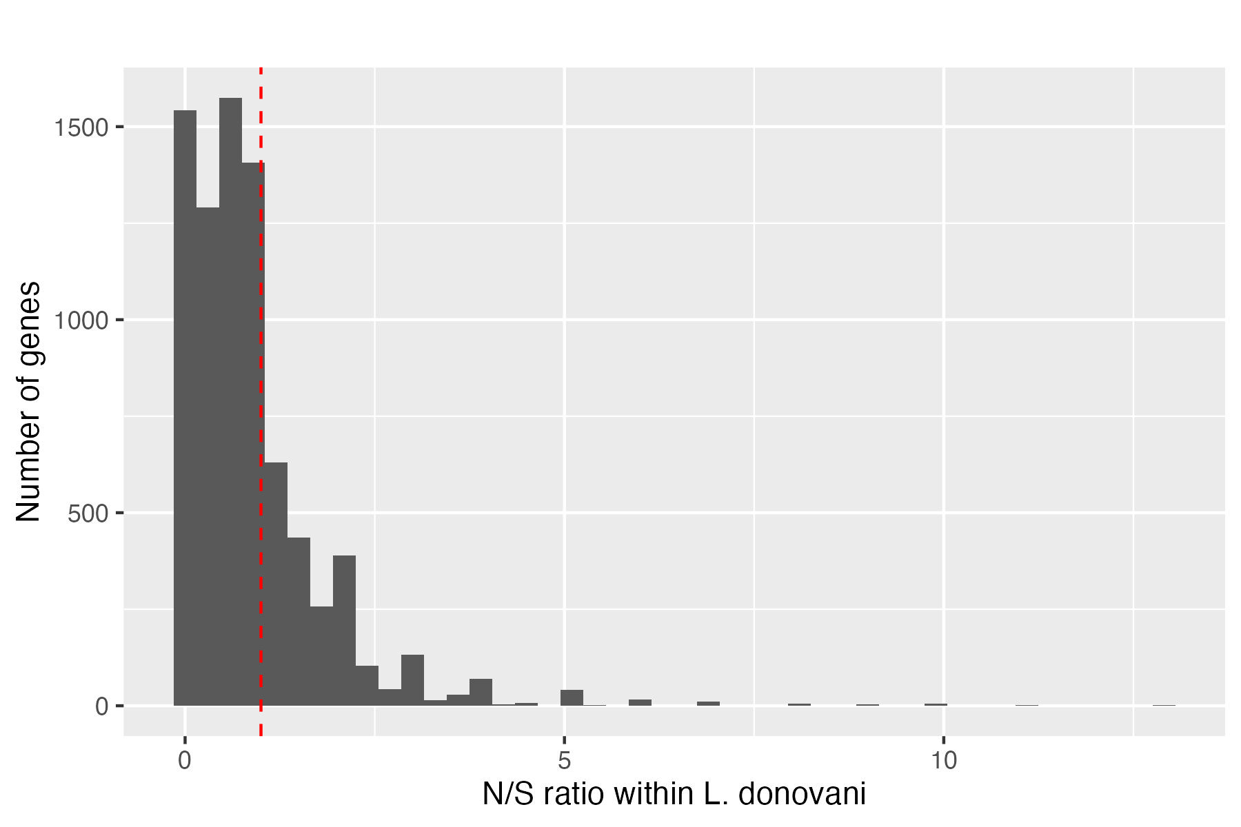 Figure 3. The distribution of N/S ratios within L. donovani genes. We can see that most genes have N/S ratios less than 1 (left of the red dashed line), indicating that purifying selection is acting on most genes.