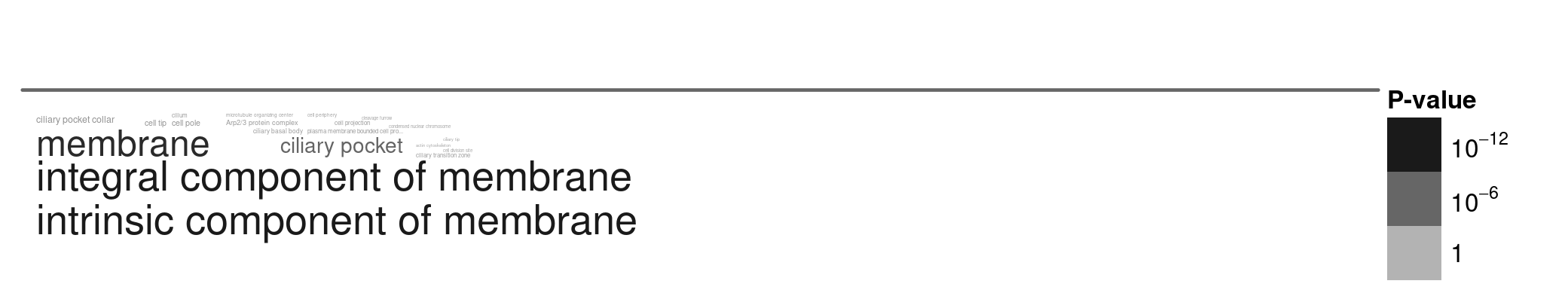 Figure 4. A word cloud showing the cellular locations enriched in positive selection genes. I selected genes with high N/S ratios (> 1.3), and ran the gene enrichment analysis using TriTrypDB. Larger words indicate greater enrichment, and the grey text intensity indicates the statistical significance of the enrichment (darker = more significant, paler = less significant).