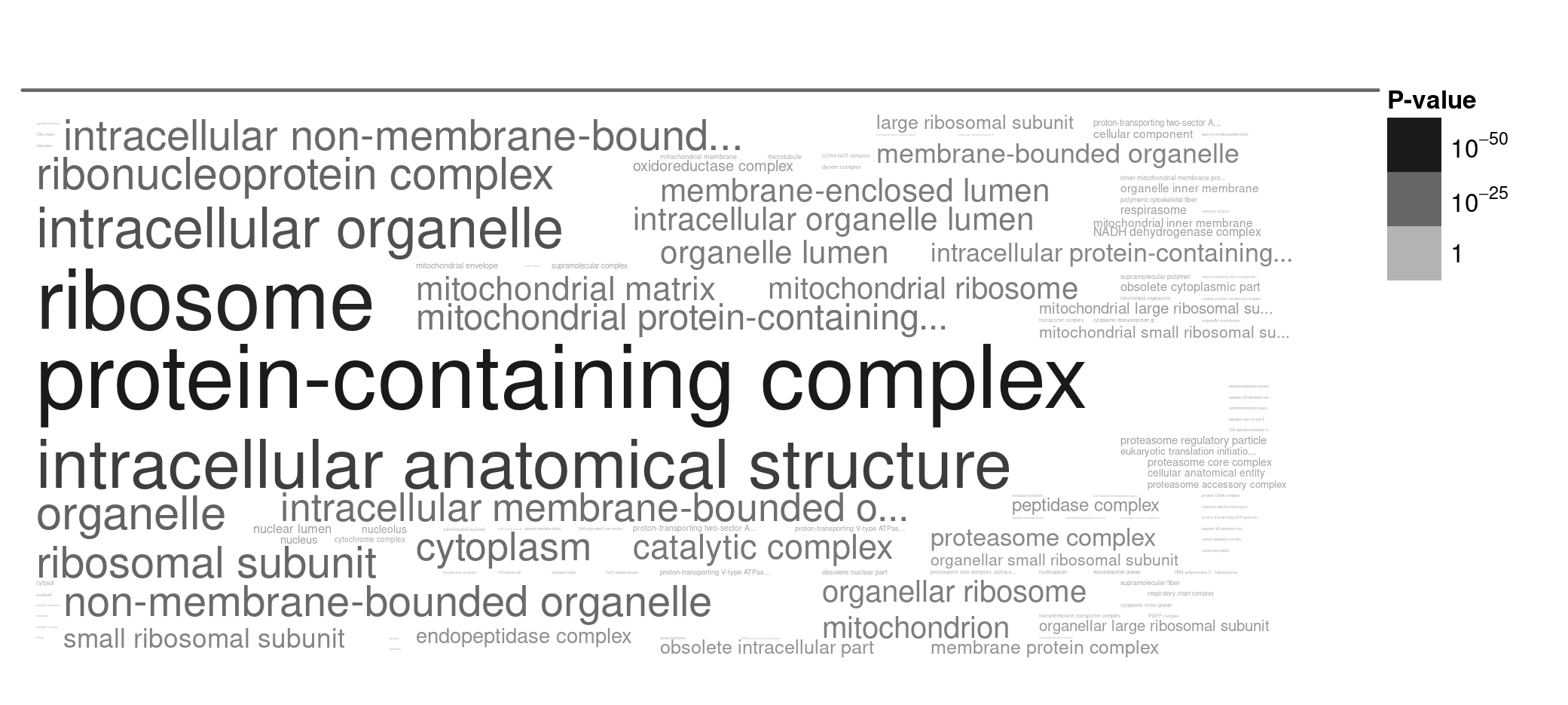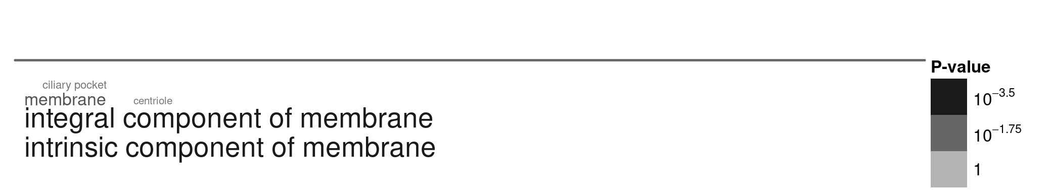 Figure 5. A word cloud showing the cellular locations enriched in genes that are subject to strong purifying selection. I selected genes with low N/S ratios (< 0.15), and ran the gene enrichment analysis using TriTrypDB. Larger words indicate greater enrichment, and the grey text intensity indicates the statistical significance of the enrichment (darker = more significant, paler = less significant).