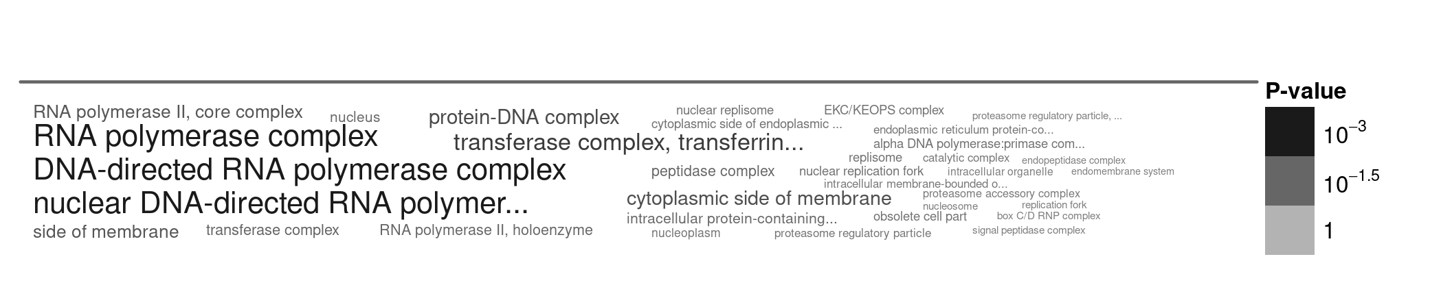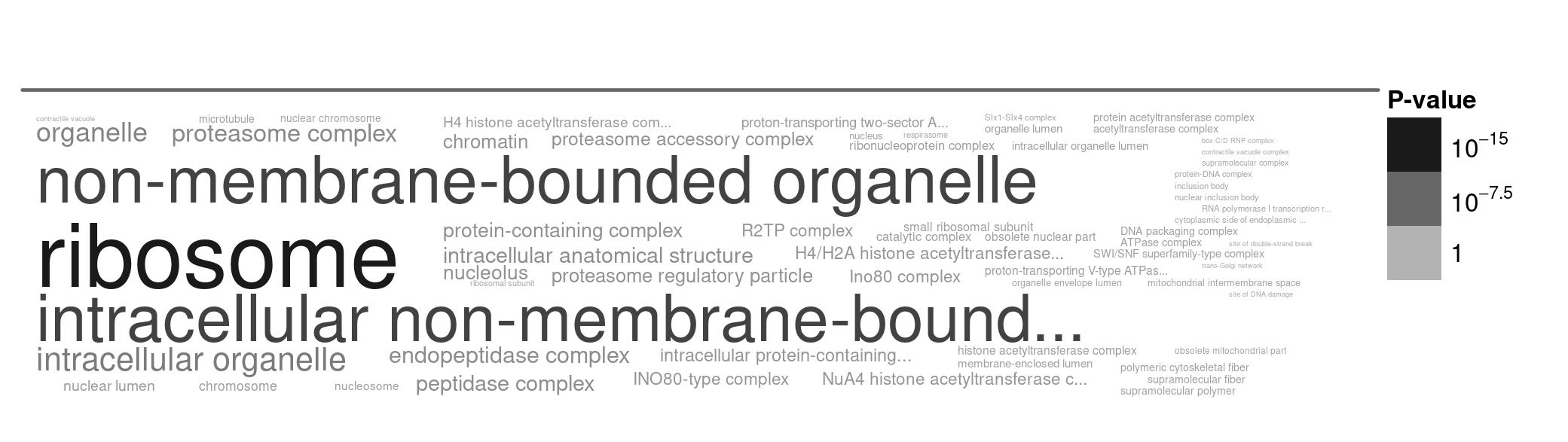 Figure 8. A word cloud showing the cellular locations enriched in very slowly evolving genes. I selected genes with high percent identity (most slowly evolving), and ran the gene enrichment analysis using TriTrypDB. Larger words indicate greater enrichment, and the grey text intensity indicates the statistical significance of the enrichment (darker = more significant, paler = less significant).