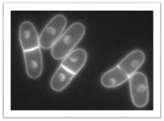Figure 1. The fission yeast Schizosaccharomyces pombe. Fission yeast is an excellent model system. It is easy to grow in the laboratory, easy to transform, and it has a very small genome (12 Mb). It has ~5,000 protein-coding genes and ~1,500 non-coding RNAs. It is haploid. Fission yeast and the budding yeast Saccharomyces cerevisiae are not closely related fungi, so study of both has contributed greatly to our understanding of molecular biology, evolutionary biology, and quantitative genetics.