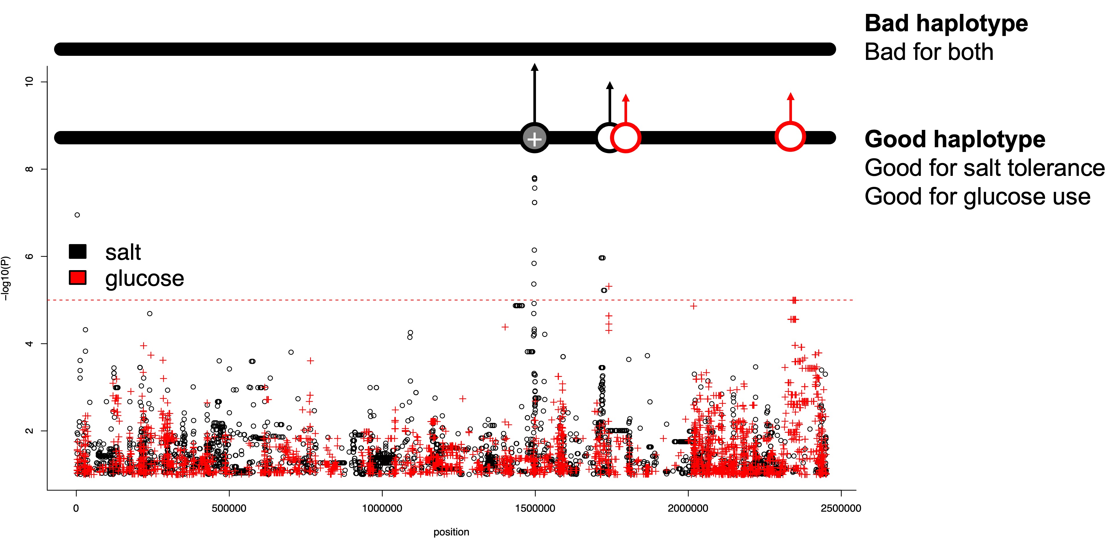 Look at the significant peak on chromosome 3 (~1,500,000 bp). This likely has a relatively large effect size. There is also an important variant for glucose/fructose use nearby on chromosome 3.