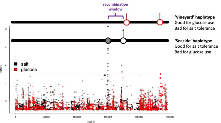 You notice that the Manhattan plots for salt tolerance and glucose/fructose utilisation share a peak on chromosome 3, but also have trait-specific peaks.