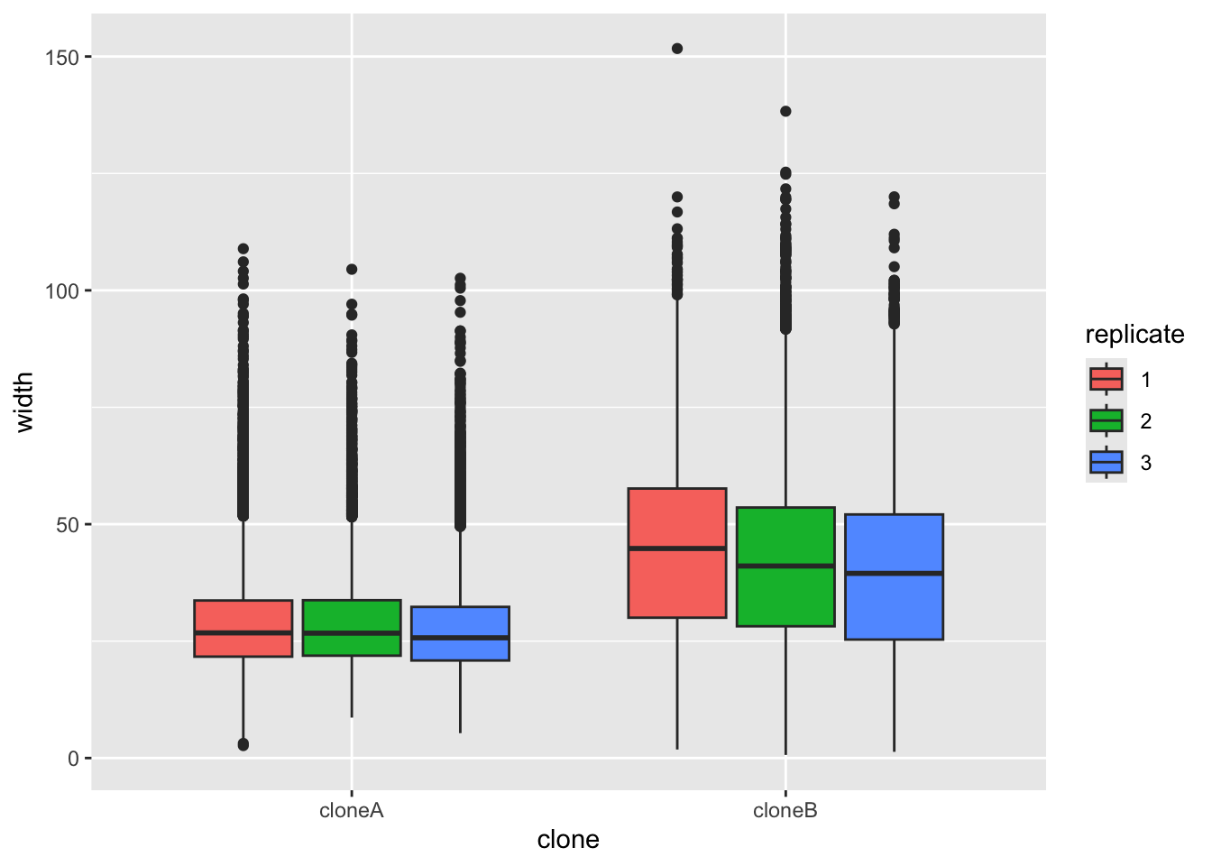 glimpse(cells)You may have noticed that we have two clones (cloneA and cloneB). For each clone, we have three replicates. For each replicate, we have many readings of cell widths, cell volume, cell sphericity, and so on.